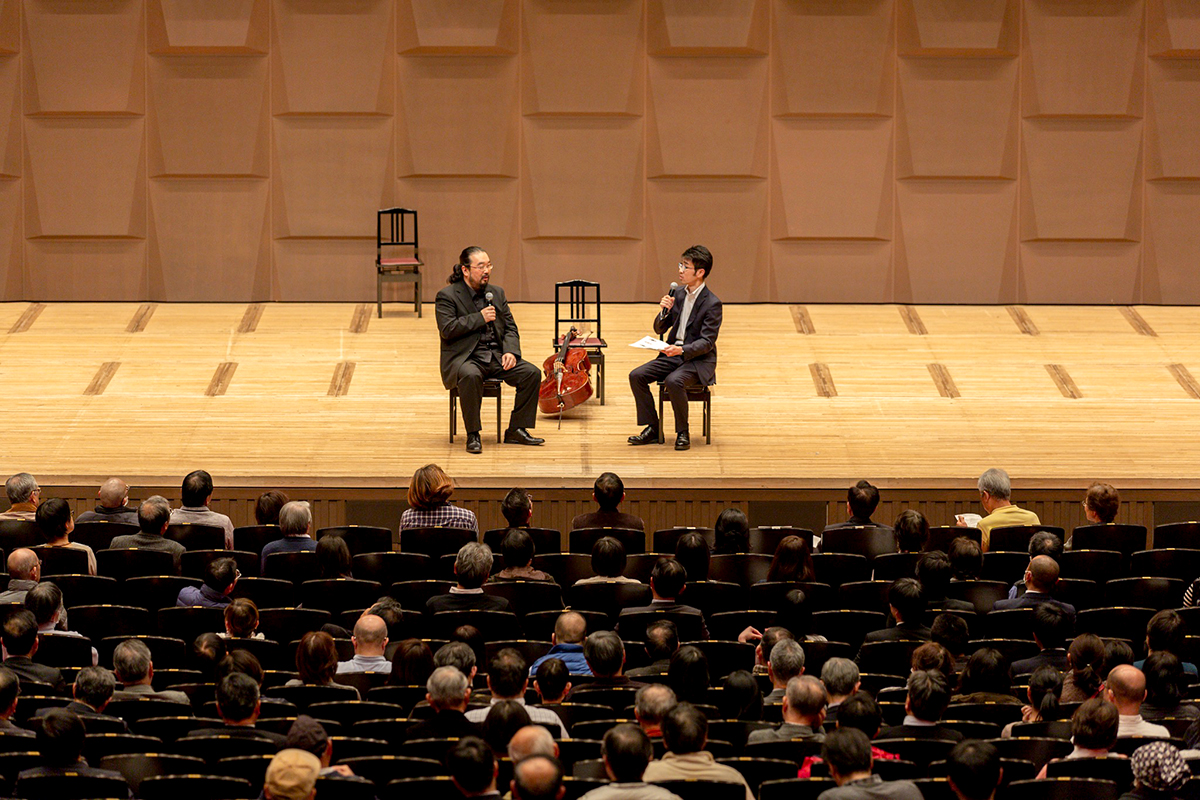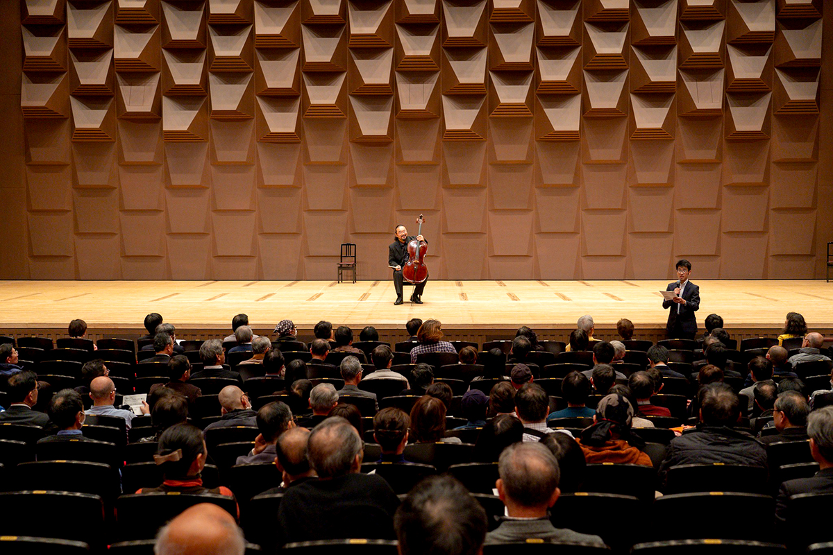 After completing a fulfilling crosstalk that talks about the mechanism of sound that cannot be easily understood (listening) just by listening to the concert, the ingenuity of the performers and hall designers, etc., a special performance by Mr. Kondo was held in a hurry Was. While listening to two songs, “Saraband” from Unaccompanied Cello Suite No. 3 and “Bird Song” from folk song Catalonia, arranged by Pablo Casals, the participants rejoiced the sound of Festival Hall.