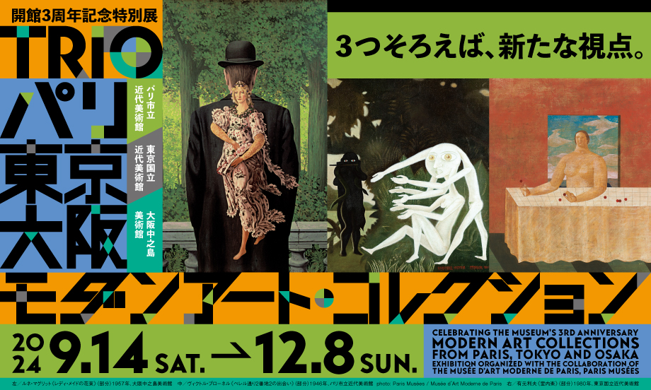 Paris, Tokyo, and Osaka: collections from three museums in these cities, each of which has nurtured its own unique culture, will come together. The Musée d’Art Moderne de la Ville de Paris on the banks of the Seine River, the National Museum of Modern Art, Tokyo near the Imperial Palace, and the Nakanoshima Museum of Art, Osaka on the central island of Osaka City, have all built rich collections of modern art as museums in major cities. This exhibition is an unprecedented and unique experiment in which works from the collections of the three museums that have something in common are selected to form a number of trios. The commonalities among the works included in each of the freely conceived trios are various, including subject matters, motifs, colors and shapes, materials, and the context in which the works were created, regardless of the era, school, or Eastern/Western backgrounds. The exhibition consists of 34 trios of more than 150 works, including paintings, sculptures, prints, drawings, photographs, designs, and videos by 110 artists, presented in seven chapters according to themes and concepts to propose a new way of viewing modern art from the early 20th century to the present day and to highlight its appeal.