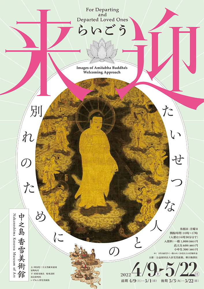Throughout history, people of all cultures have asked the existential question, “Where do we go after we die?” A popular Buddhistic response to this question in medieval Japan was the western Pure Land (J. saihō jōdo) of the Buddha Amitabha (J. Amida). The idea of being born in a resplendent, distant paradise and envisioning departed loved ones there gave hope and solace to many facing the fear of death. These sentiments contributed to the popularity of Pure Land beliefs and resulted in the production of numerous raigō zu (“welcoming approach” paintings), in which Amitabha Buddha attended by a multitude of bodhisattvas appears before devotees at the time of their death, and jōdo zu (Pure Land paintings), which depict scenes of Amitabha’s paradise that awaits devotees after death. The Asahi Shimbun newspaper agency founder, Murayama Ryōhei (1850–1933) whose personal collection comprises the core of the artworks in the Kosetsu Museum of Art, also collected many examples of Pure Land Buddhist art. This exhibition highlights the paintings of Amitabha Buddha’s Welcoming Approach and the Pure Land, together with other related artworks and artifacts. Also presented here are two unusual paintings that have recently restored–Amitabha Buddha and Assembly of Bodhisattvas Returning to the Pure Land with the Departed and Amitabha Triad in Lotus Pond.